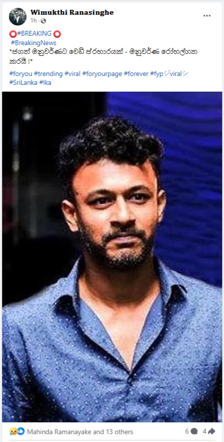 “ජගත් මනුවර්ණට වෙඩි ප්රහාරයක් – මනුවර්ණ රෝහල්ගත කරයි !” යනුවෙන් සඳහන් කරමින් සමාජ මාධ්ය සටහන් සමාජ මාධ්ය ඔස්සේ සංසරණය වූයේ මෙලෙසින්.